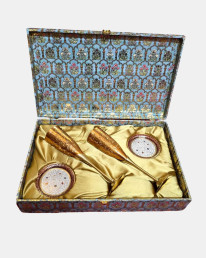 Hiranya, meaning “golden” in Sanskrit, evokes the quiet opulence of India’s artisanal metalcraft. At its heart lie GI-tagged Moradabad brass wine flutes, gold plated and handcrafted with old-world finesse and contemporary elegance. Paired with coasters, this set’s graceful design and golden lustre, pays homage to centuries of fine metalwork from the famed “Peetal Nagri” of Uttar Pradesh.