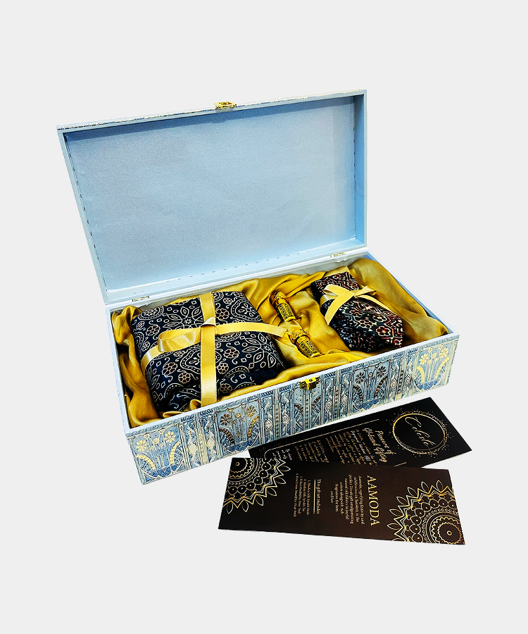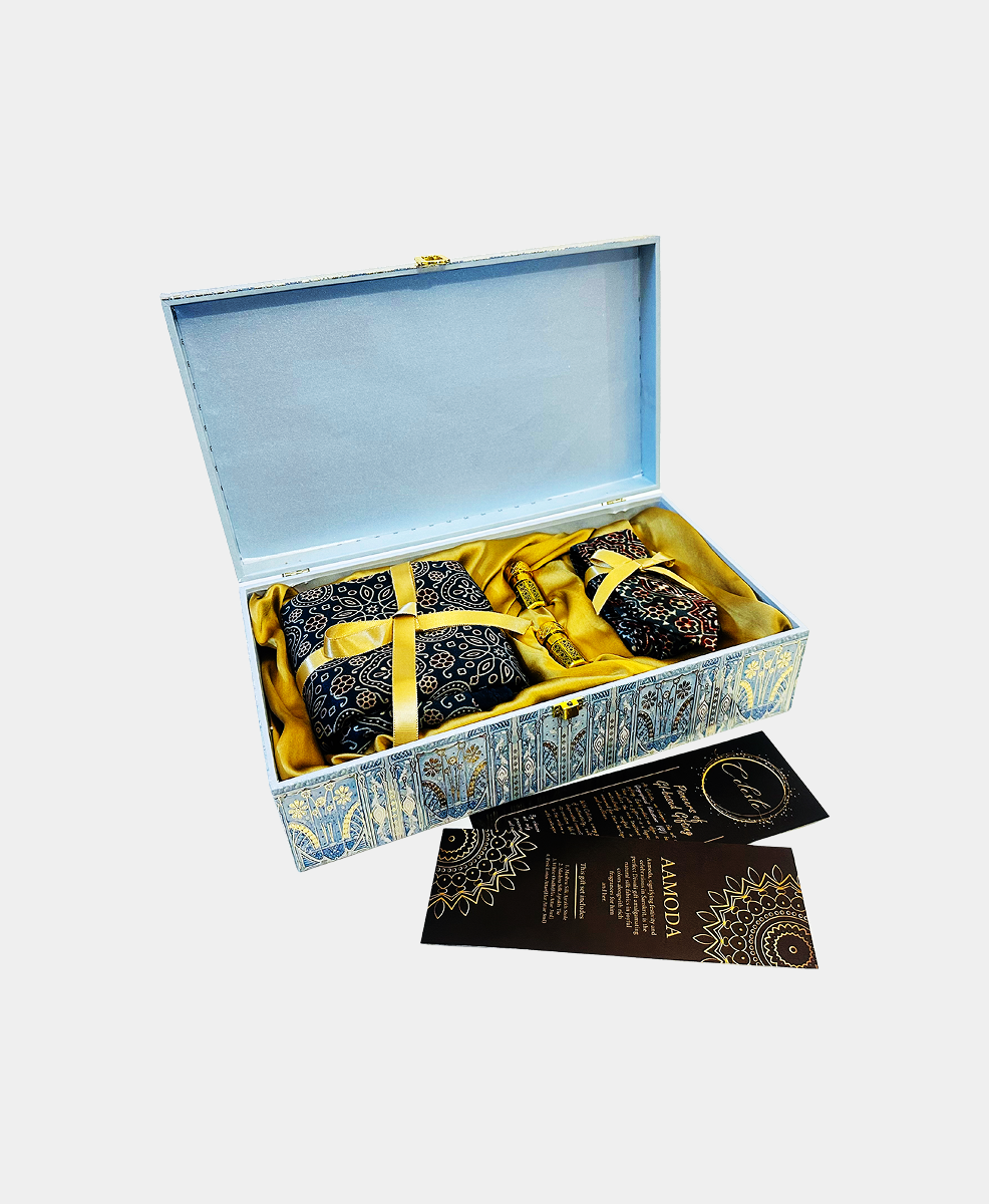 Aamoda, signifying festivity and celebrations in Sanskrit, is the perfect Diwali gift amalgamating natural silk fabrics in joyful colors alongwith rich fragrances for him and her.