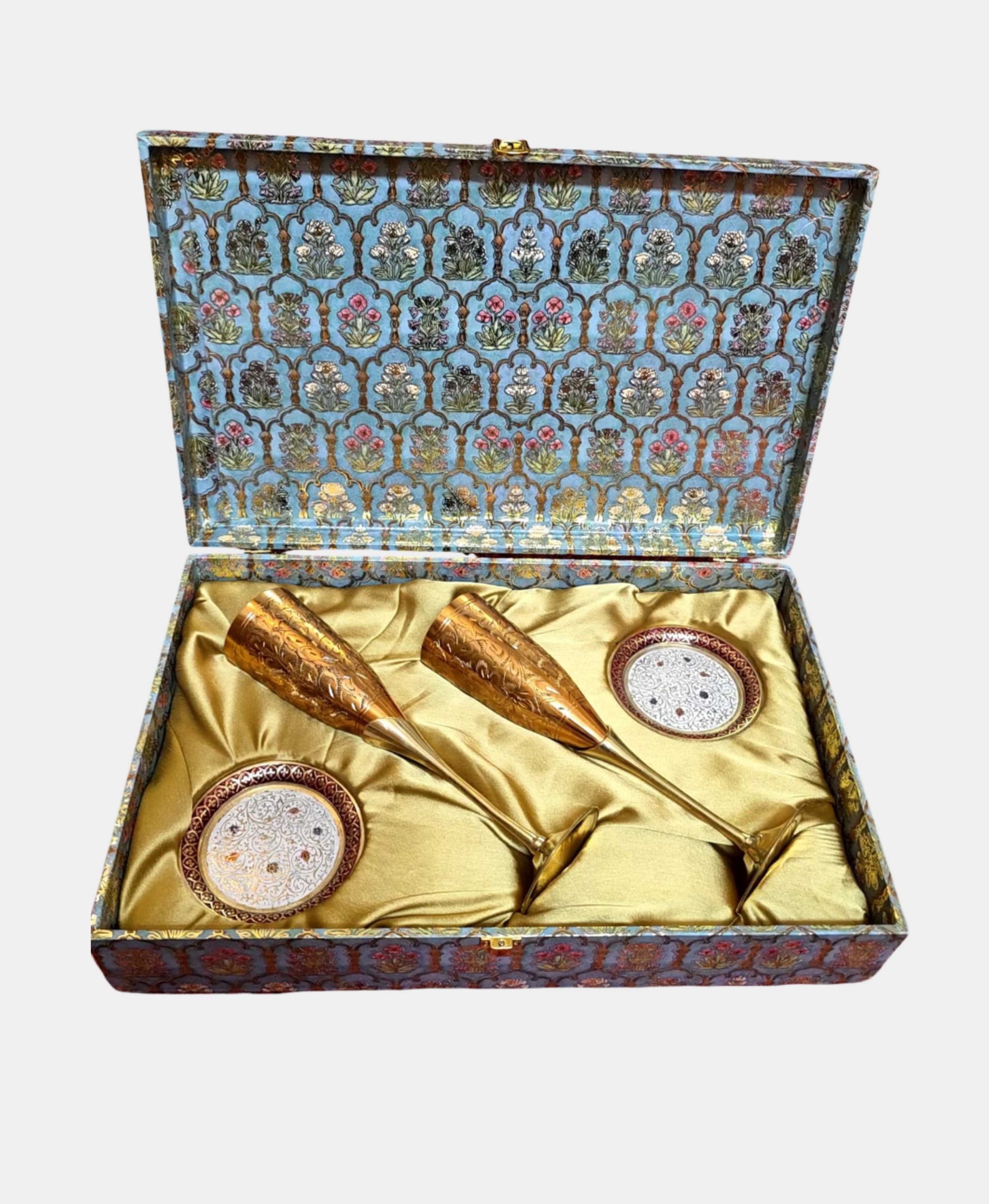 Intricately handcrafted, copper and gold plated champagne flutes are paired with matching coasters etched in traditional motifs. This set is not only one that makes any celebration grand, but one that transforms any pour into a ritual of beauty and warmth. Similar sets can be found in use in celebrations across Indian palaces and worldwide aristocracy. The gleam of brass catches the candlelight, whispering stories of regal banquets and timeless celebration. Hiranya is not merely a gift—it is a toast to heritage, a table adorned with legacy, and an invitation to savour life’s most golden moments.