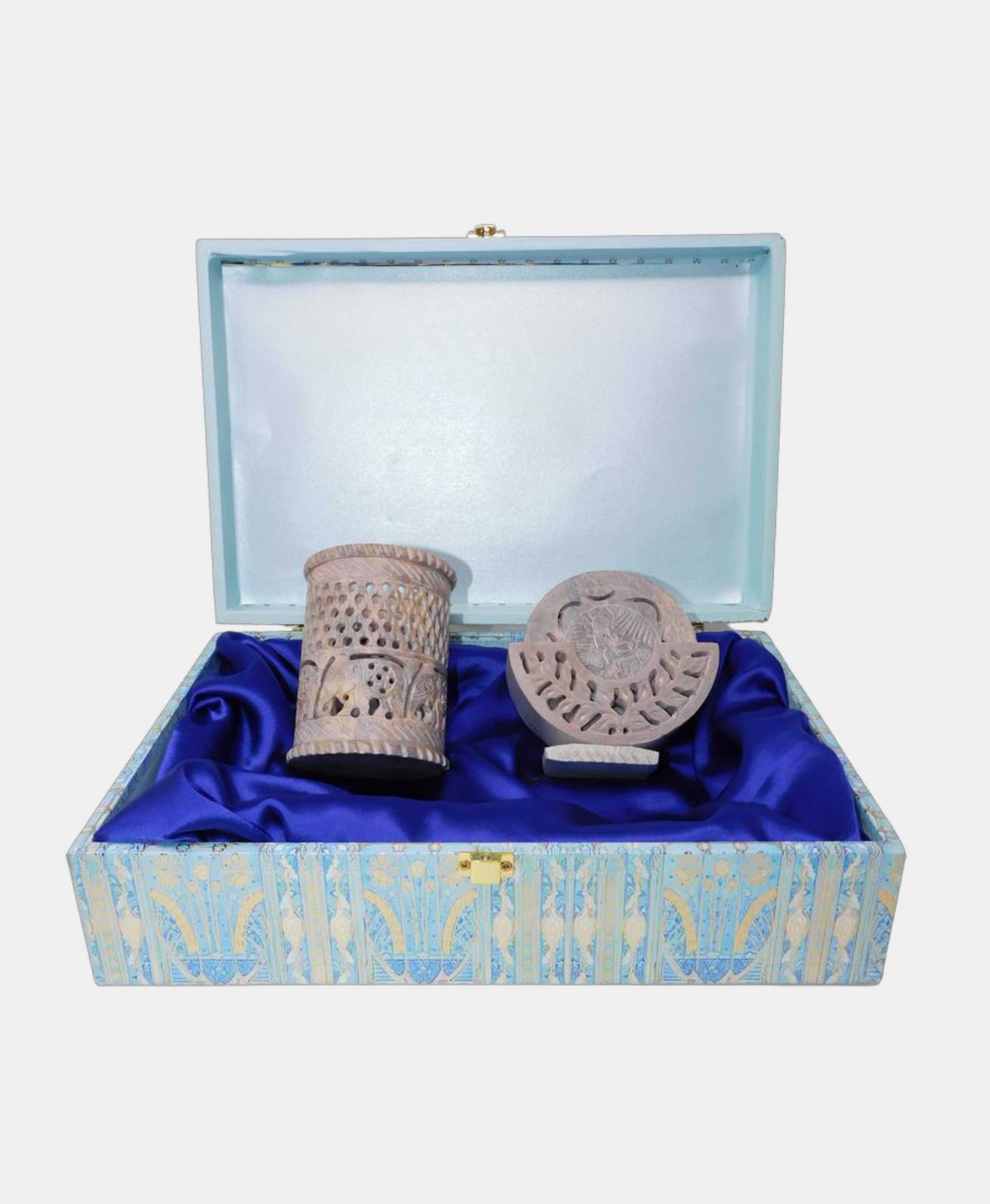 Kāntivardhanam in Sanskrit , is the “Enhancer of Splendor”. This intricate set o f banarasi stone co asters paired with banarsi stone pen stand will definitely add splendor to your table.