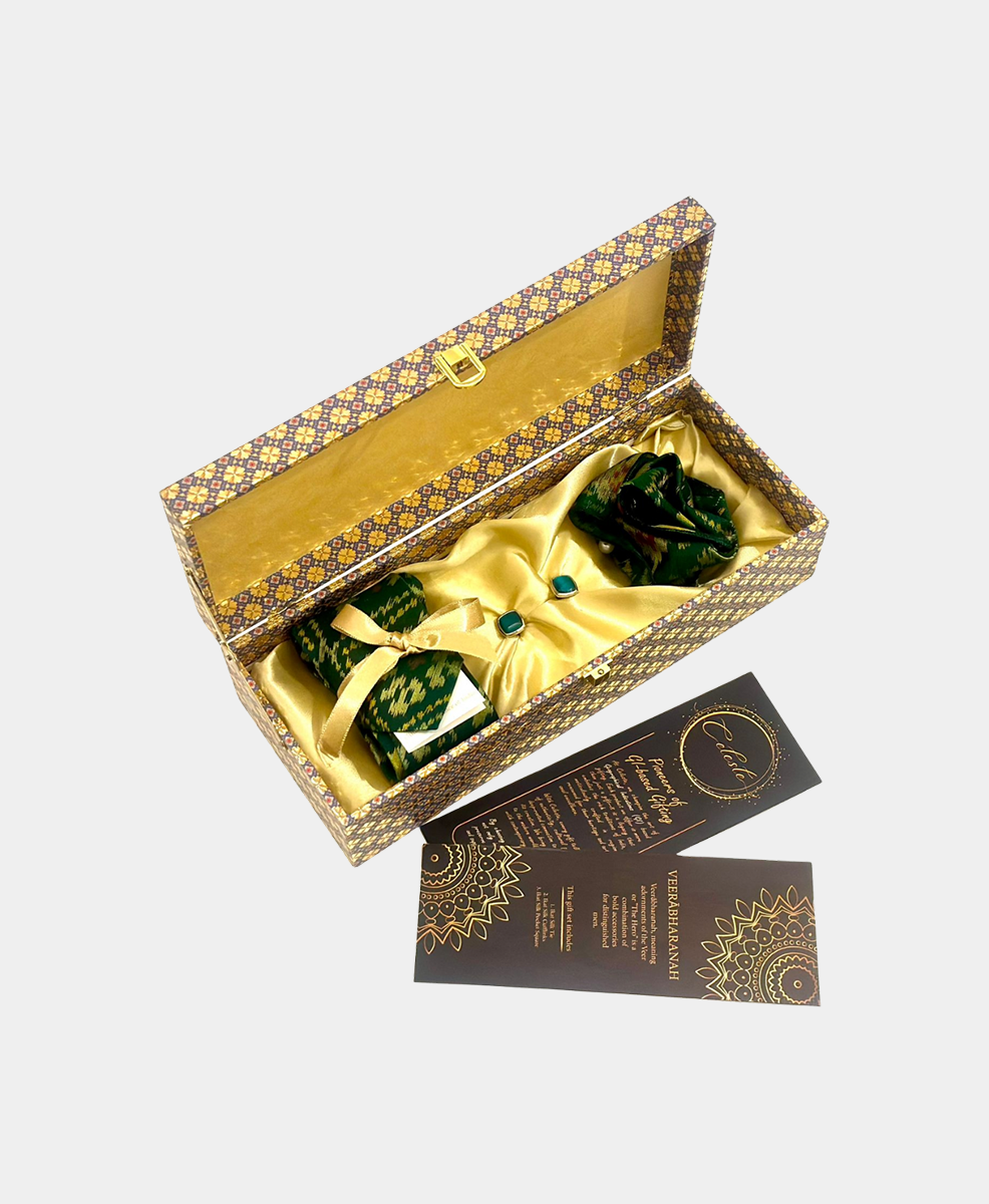 A masterpiece crafted with the intricately woven and vibrantly patterned handloom fabric, our Silk Ikat Men’s Accessory Combination sets the wearer apart as a leader among leaders.